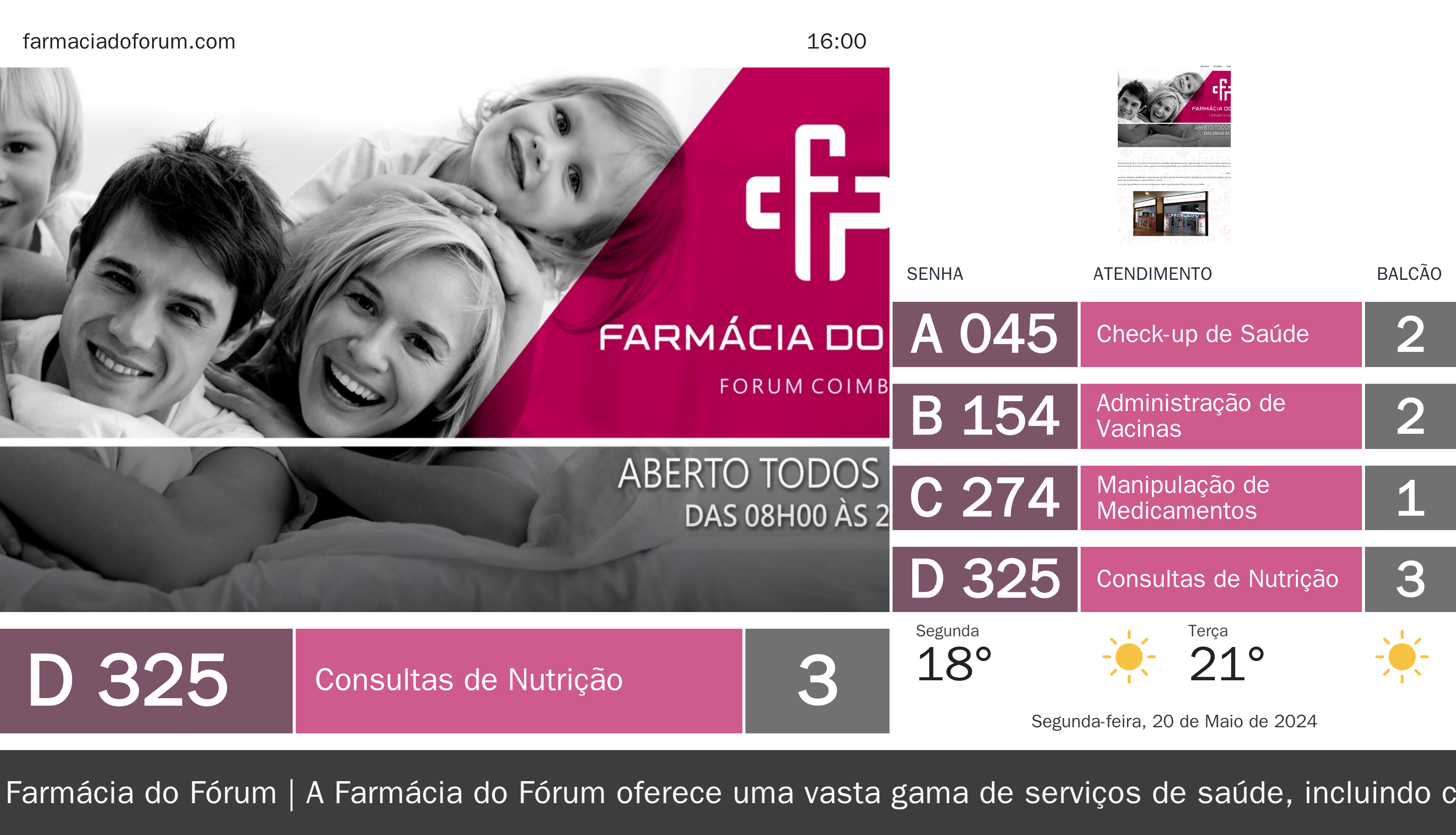A solução Q.track inclui um quiosque de senhas, ecrãs de chamada e TV corporativa, todos personalizáveis e alinhados à identidade visual da Farmácia do Fórum. Com exemplos visuais disponíveis, como o Q.kiosk, podemos demonstrar como a vossa marca pode beneficiar de um ambiente mais organizado e eficiente para os clientes.