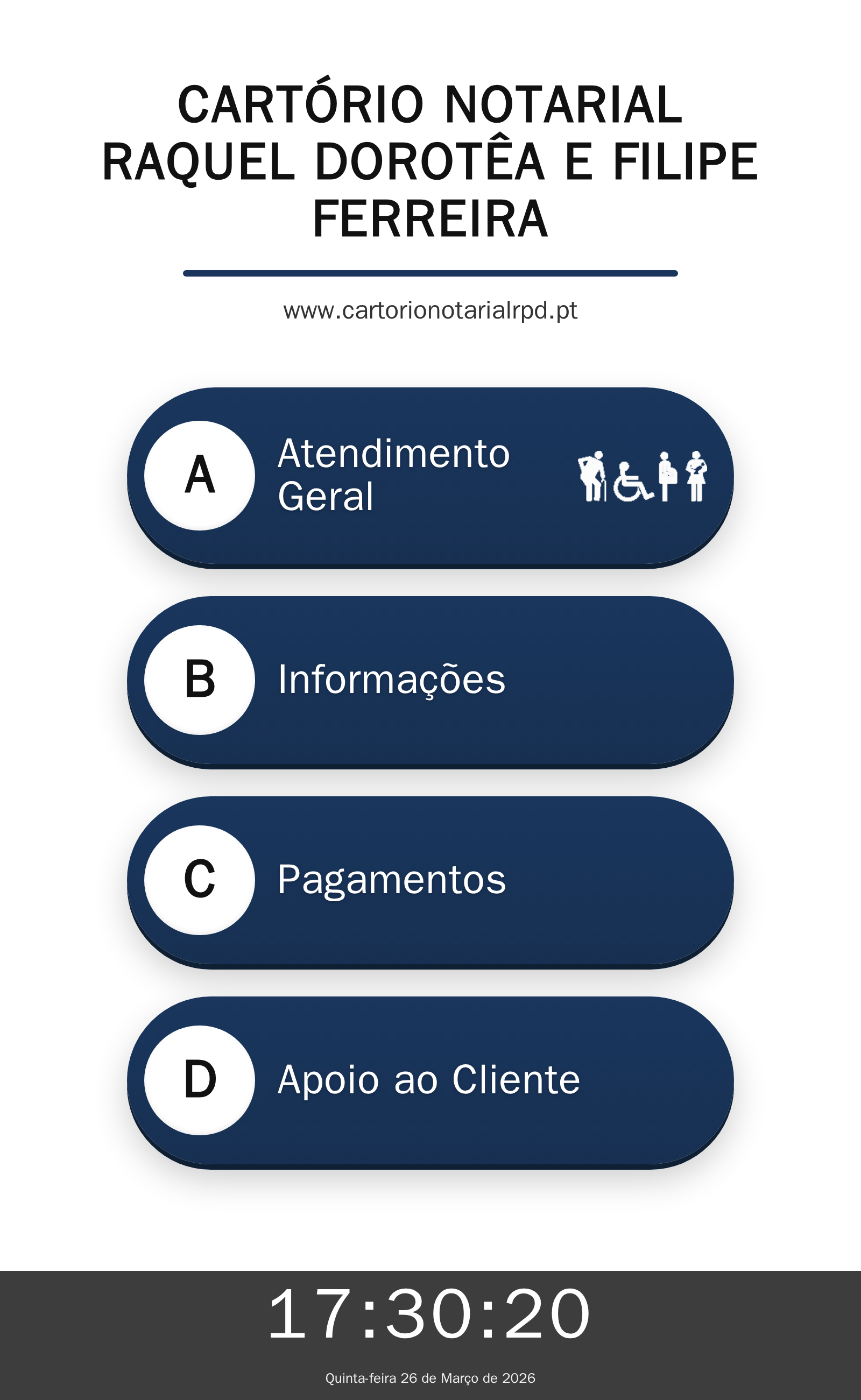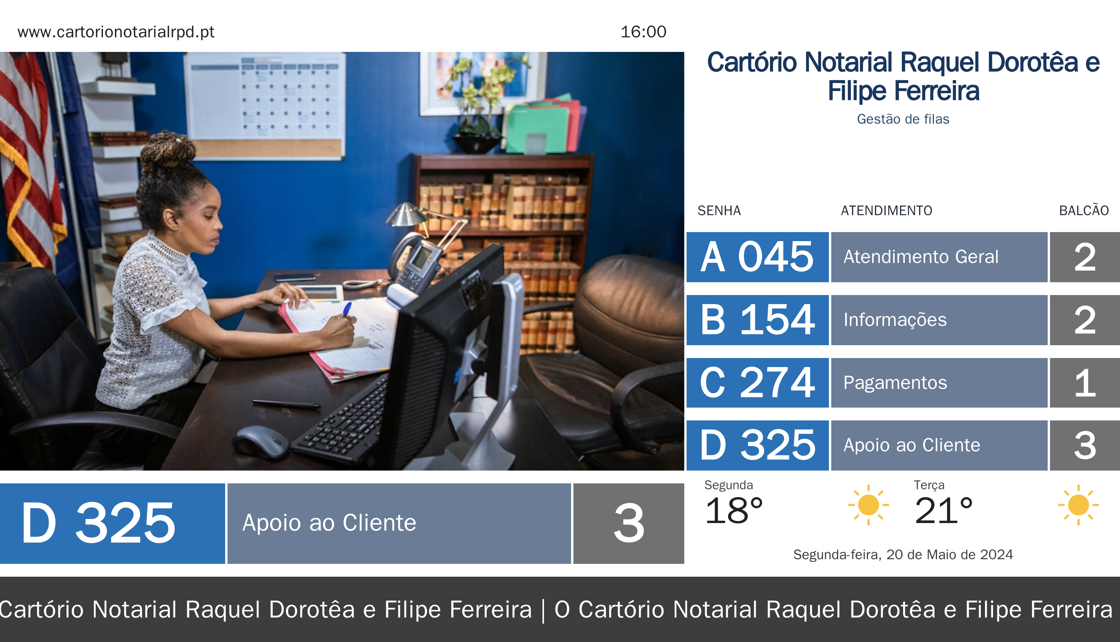 A Q.track é uma solução inovadora que inclui quiosques de senhas e ecrãs de chamada, proporcionando um fluxo de espera mais eficiente e organizado. Além disso, a TV corporativa permite comunicar informações importantes de forma visual e alinhada à identidade do Cartório.